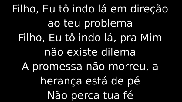 - Filho, Eu tô indo lá em direção ao teu problemaFilho, Eu tô indo lá, pra Mim não existe dilemaA promessa não morreu, a herança está de péNão perca tua fé