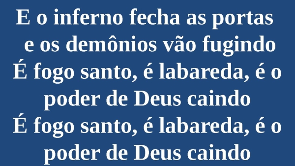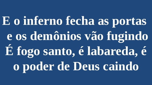 - E o inferno fecha as portas e os demônios vão fugindoÉ fogo santo, é labareda, é o poder de Deus caindo
