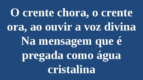 - O crente chora, o crente ora, ao ouvir a voz divinaNa mensagem que é pregada como água cristalina