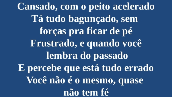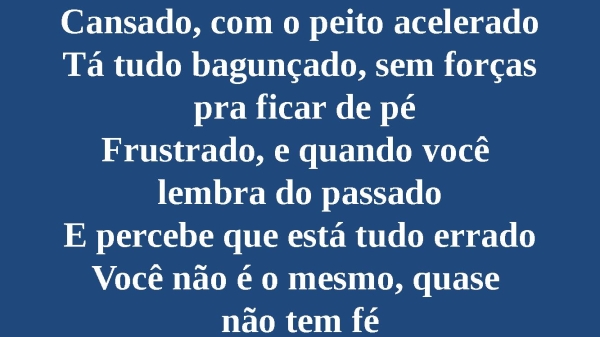 - Cansado, com o peito aceleradoTá tudo bagunçado, sem forças pra ficar de péFrustrado, e quando você lembra do passadoE percebe que está tudo erradoVocê não é o mesmo, quase não tem fé