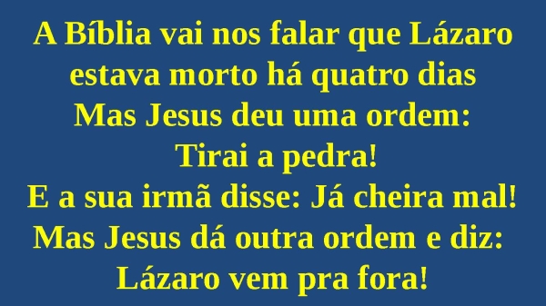 - A Bíblia vai nos falar que Lázaro estava morto há quatro diasMas Jesus deu uma ordem: Tirai a pedra!E a sua irmã disse: Já cheira mal!Mas Jesus dá outra ordem e diz: Lázaro vem pra fora!