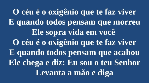- O céu é o oxigênio que te faz viverE quando todos pensam que morreuEle sopra vida em você O céu é o oxigênio que te faz viverE quando todos pensam que acabouEle chega e diz: Eu sou o teu SenhorLevanta a mão e diga