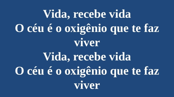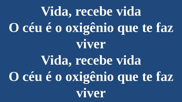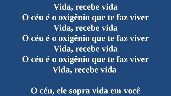 - Vida, recebe vidaO céu é o oxigênio que te faz viverVida, recebe vidaO céu é o oxigênio que te faz viverVida, recebe vidaO céu é o oxigênio que te faz viverVida, recebe vida O céu, ele sopra vida em você