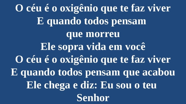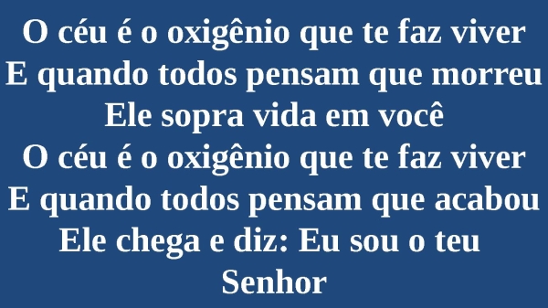 - O céu é o oxigênio que te faz viverE quando todos pensam que morreuEle sopra vida em vocêO céu é o oxigênio que te faz viverE quando todos pensam que acabouEle chega e diz: Eu sou o teu Senhor