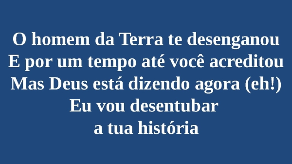 - O homem da Terra te desenganouE por um tempo até você acreditouMas Deus está dizendo agora (eh!)Eu vou desentubar a tua história