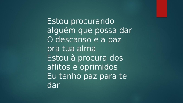 - Estou procurando alguém que possa darO descanso e a paz pra tua almaEstou à procura dos aflitos e oprimidosEu tenho paz para te dar