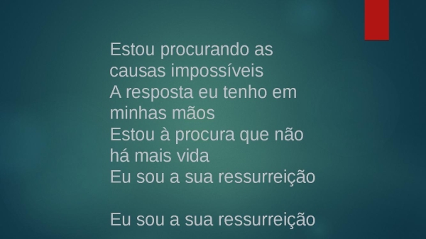 - Estou procurando as causas impossíveisA resposta eu tenho em minhas mãosEstou à procura que não há mais vidaEu sou a sua ressurreiçãoEu sou a sua ressurreição