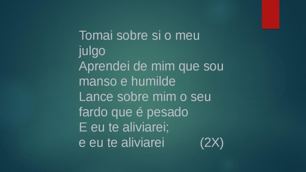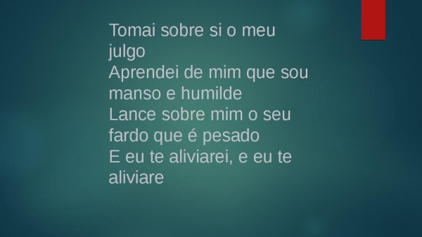 - Tomai sobre si o meu julgoAprendei de mim que sou manso e humildeLance sobre mim o seu fardo que é pesadoE eu te aliviarei, e eu te aliviarei