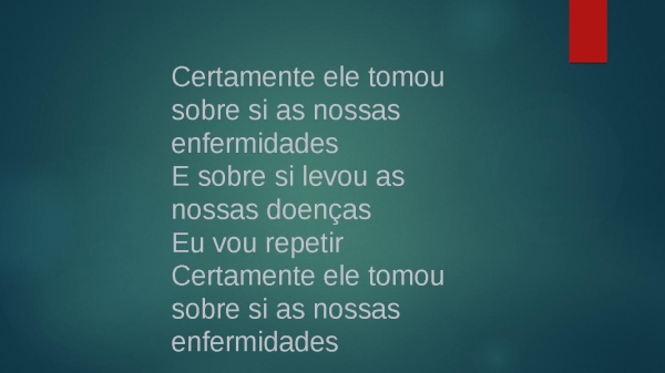 - Certamente ele tomou sobre si as nossas enfermidadesE sobre si levou as nossas doençasEu vou repetirCertamente ele tomou sobre si as nossas enfermidades