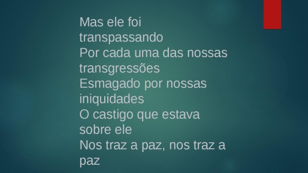 - Mas ele foi transpassandoPor cada uma das nossas transgressõesEsmagado por nossas iniquidadesO castigo que estava sobre eleNos traz a paz, nos traz a paz