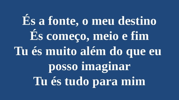 - És a fonte, o meu destinoÉs começo, meio e fimTu és muito além do que eu posso imaginarTu és tudo para mim