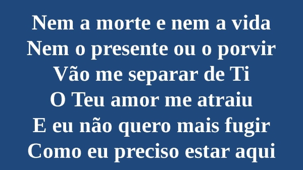 - Nem a morte e nem a vidaNem o presente ou o porvirVão me separar de TiO Teu amor me atraiuE eu não quero mais fugirComo eu preciso estar aqui