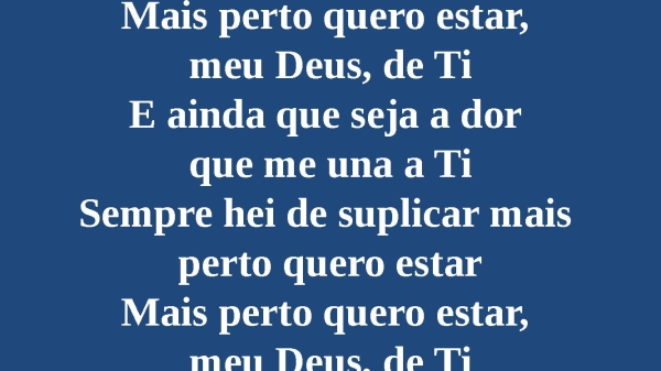 - Mais perto quero estar, meu Deus, de TiE ainda que seja a dor que me una a TiSempre hei de suplicar mais perto quero estarMais perto quero estar, meu Deus, de Ti