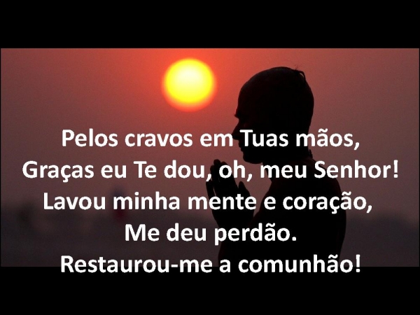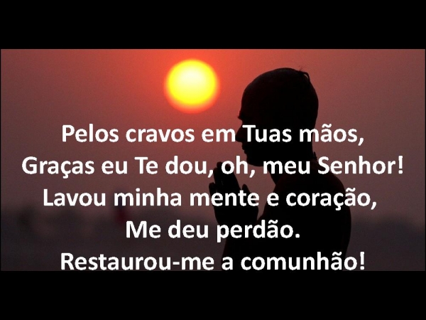 - Pelos cravos em Tuas mãos,Graças eu Te dou, oh, meu Senhor!Lavou minha mente e coração, Me deu perdão.Restaurou-me a comunhão!