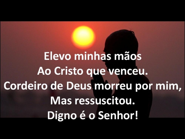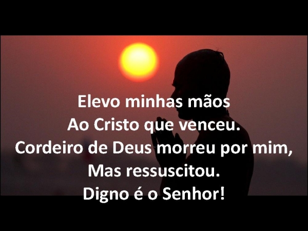 - Elevo minhas mãosAo Cristo que venceu.Cordeiro de Deus morreu por mim,Mas ressuscitou.Digno é o Senhor!