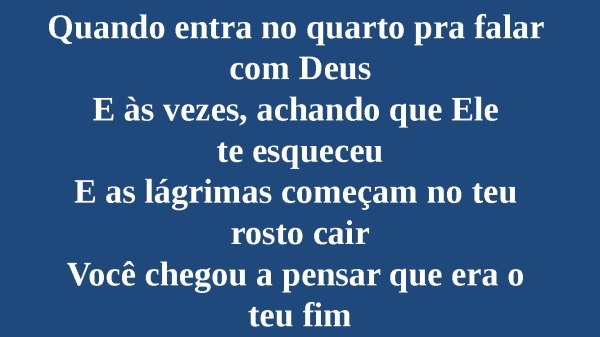 - Quando entra no quarto pra falar com DeusE às vezes, achando que Ele te esqueceuE as lágrimas começam no teu rosto cairVocê chegou a pensar que era o teu fim