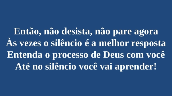 - Então, não desista, não pare agoraÀs vezes o silêncio é a melhor respostaEntenda o processo de Deus com vocêAté no silêncio você vai aprender!