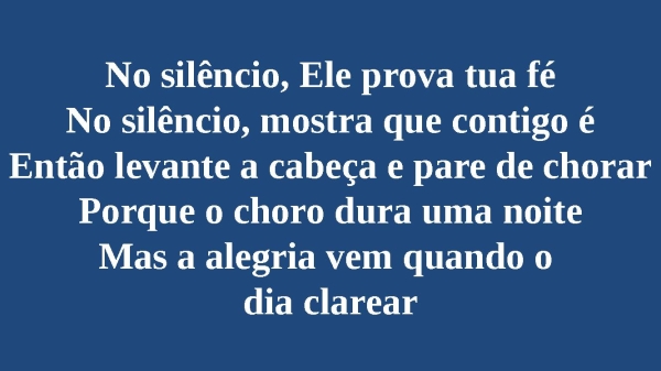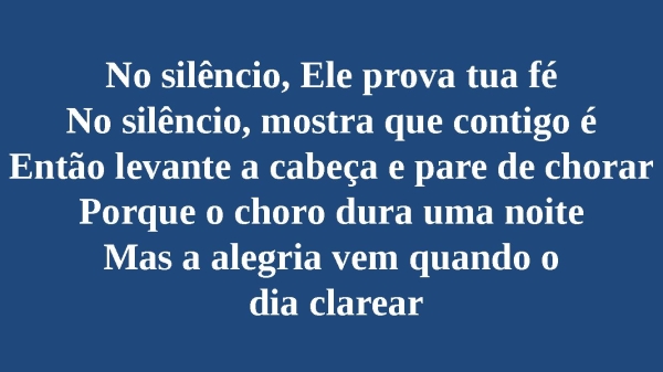 - No silêncio, Ele prova tua féNo silêncio, mostra que contigo éEntão levante a cabeça e pare de chorarPorque o choro dura uma noiteMas a alegria vem quando o dia clarear