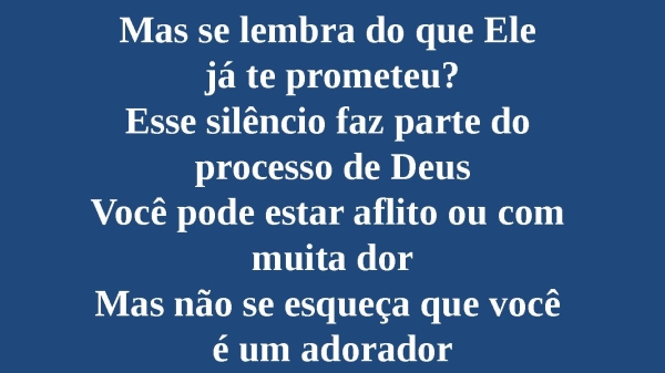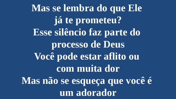 - Mas se lembra do que Ele já te prometeu?Esse silêncio faz parte do processo de DeusVocê pode estar aflito ou com muita dorMas não se esqueça que você é um adorador