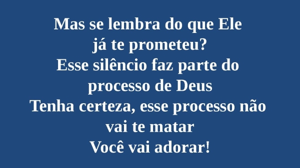 - Mas se lembra do que Ele já te prometeu?Esse silêncio faz parte do processo de DeusTenha certeza, esse processo não vai te matarVocê vai adorar!