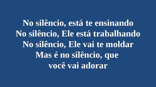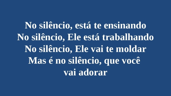 - No silêncio, está te ensinandoNo silêncio, Ele está trabalhandoNo silêncio, Ele vai te moldarMas é no silêncio, que você vai adorar