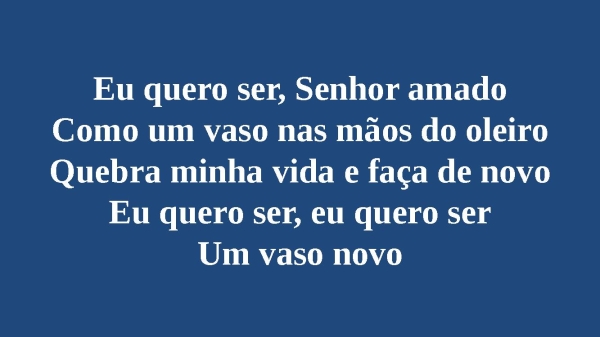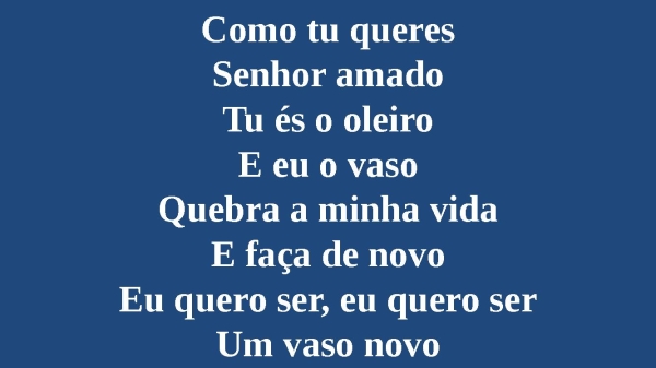 - Como tu queresSenhor amadoTu és o oleiroE eu o vasoQuebra a minha vidaE faça de novoEu quero ser, eu quero serUm vaso novo
