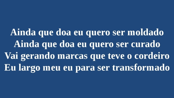 - Ainda que doa eu quero ser moldadoAinda que doa eu quero ser curadoVai gerando marcas que teve o cordeiroEu largo meu eu para ser transformado