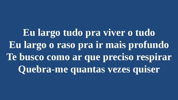 - Eu largo tudo pra viver o tudoEu largo o raso pra ir mais profundoTe busco como ar que preciso respirarQuebra-me quantas vezes quiser