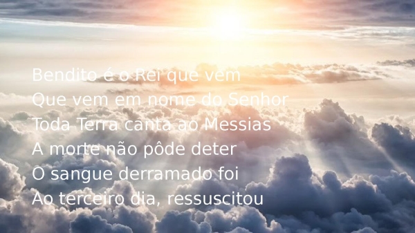 - Bendito é o Rei que vemQue vem em nome do SenhorToda Terra canta ao MessiasA morte não pôde deterO sangue derramado foiAo terceiro dia, ressuscitou