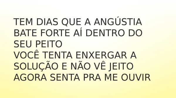 - Tem dias que a angústia bate forte aí dentro do seu peitoVocê tenta enxergar a solução e não vê jeitoAgora senta pra me ouvir