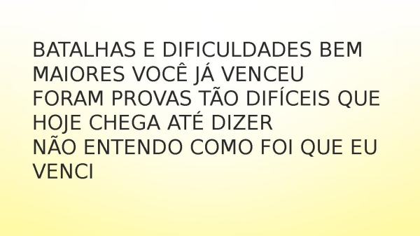 - Batalhas e dificuldades bem maiores você já venceuForam provas tão difíceis que hoje chega até dizerNão entendo como foi que eu venci