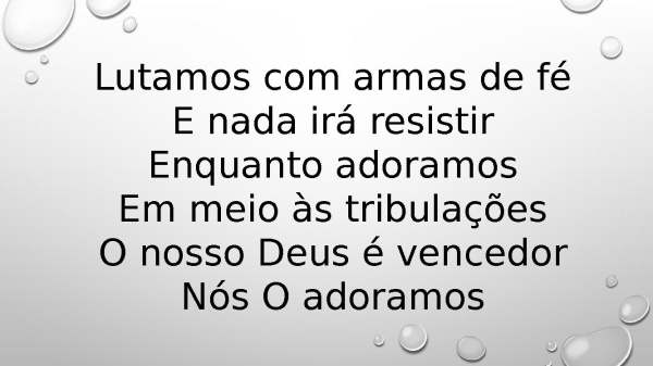 - Lutamos com armas de féE nada irá resistirEnquanto adoramosEm meio às tribulaçõesO nosso Deus é vencedorNós O adoramos