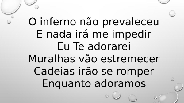 - O inferno não prevaleceuE nada irá me impedirEu Te adorareiMuralhas vão estremecerCadeias irão se romperEnquanto adoramos