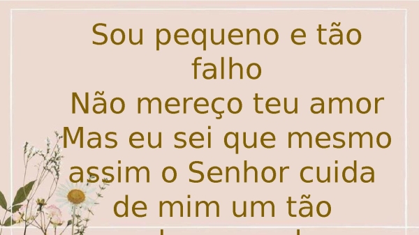 - Sou pequeno e tão falhoNão mereço teu amorMas eu sei que mesmo assim o Senhor cuida de mim um tão pobre pecador