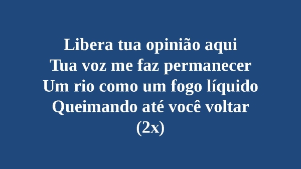 - Libera tua opinião aquiTua voz me faz permanecerUm rio como um fogo líquidoQueimando até você voltar(2x)