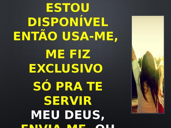 - Eis-me aqui, estou disponívelEntão usa-me, me fiz exclusivo só pra Te servirMeu Deus, envia-me, oh