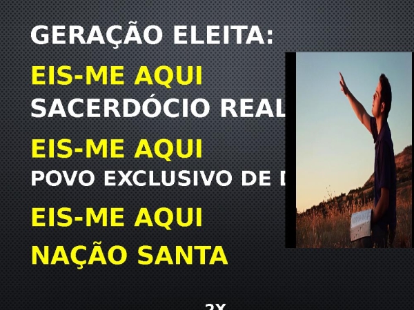 - Geração eleita:eis-me aquiSacerdócio real : eis-me aquiPovo exclusivo de Deus: eis-me aquiNação santa 2x