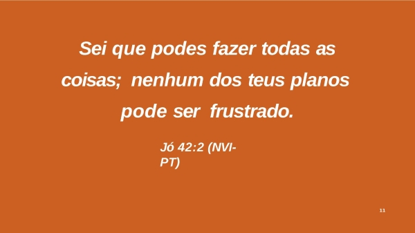 - Sei que podes fazer todas as coisas; nenhum dos teus planos pode ser frustrado.10Jó 42:2 (NVI-PT)