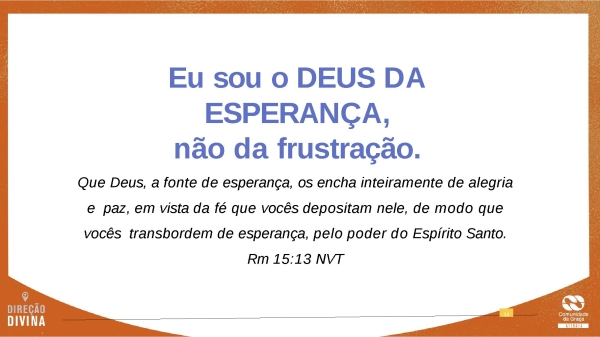 - 12Eu sou o DEUS DA ESPERANÇA,não da frustração.Que Deus, a fonte de esperança, os encha inteiramente de alegria e paz, em vista da fé que vocês depositam nele, de modo que vocês transbordem de esperança, pelo poder do Espírito Santo.Rm 15:13 NVT