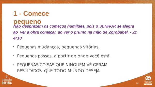 - 1 - Comece pequeno14Não desprezem os começos humildes, pois o SENHOR se alegra ao ver a obra começar, ao ver o prumo na mão de Zorobabel. - Zc 4:10Pequenas mudanças, pequenas vitórias.Pequenos passos, a partir de onde você está.PEQUENAS COISAS QUE NINGUEM VÊ GERAM RESULTADOS QUE TODO MUNDO DESEJA