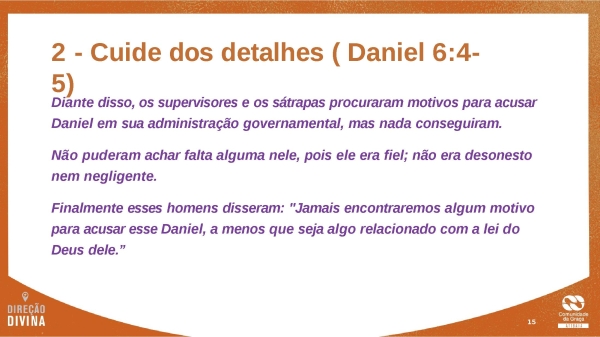 - 2 - Cuide dos detalhes ( Daniel 6:4-5)14Diante disso, os supervisores e os sátrapas procuraram motivos para acusar Daniel em sua administração governamental, mas nada conseguiram.Não puderam achar falta alguma nele, pois ele era fiel; não era desonesto nem negligente.Finalmente esses homens disseram: "Jamais encontraremos algum motivo para acusar esse Daniel, a menos que seja algo relacionado com a lei do Deus dele.”