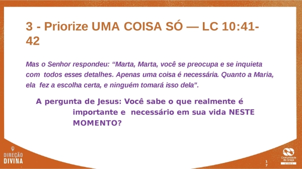 - 173 - Priorize UMA COISA SÓ — LC 10:41-42Mas o Senhor respondeu: “Marta, Marta, você se preocupa e se inquieta com todos esses detalhes. Apenas uma coisa é necessária. Quanto a Maria, ela fez a escolha certa, e ninguém tomará isso dela”.A pergunta de Jesus: Você sabe o que realmente é importante e necessário em sua vida NESTE MOMENTO?