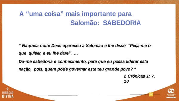 - A “uma coisa” mais importante para Salomão: SABEDORIA18“ Naquela noite Deus apareceu a Salomão e lhe disse: "Peça-me o que quiser, e eu lhe darei”. …Dá-me sabedoria e conhecimento, para que eu possa liderar esta nação, pois, quem pode governar este teu grande povo? “2 Crônicas 1: 7, 10