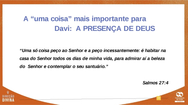 - A “uma coisa” mais importante para Davi: A PRESENÇA DE DEUS18“Uma só coisa peço ao Senhor e a peço incessantemente: é habitar na casa do Senhor todos os dias de minha vida, para admirar aí a beleza do Senhor e contemplar o seu santuário.”Salmos 27:4