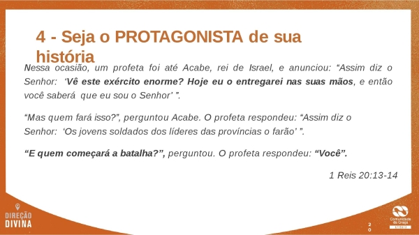 - 204 - Seja o PROTAGONISTA de sua históriaNessa ocasião, um profeta foi até Acabe, rei de Israel, e anunciou: “Assim diz o Senhor: ‘Vê este exército enorme? Hoje eu o entregarei nas suas mãos, e então você saberá que eu sou o Senhor’ ”.“Mas quem fará isso?”, perguntou Acabe. O profeta respondeu: “Assim diz o Senhor: ‘Os jovens soldados dos líderes das províncias o farão’ ”.“E quem começará a batalha?”, perguntou. O profeta respondeu: “Você”.1 Reis 20:13-14