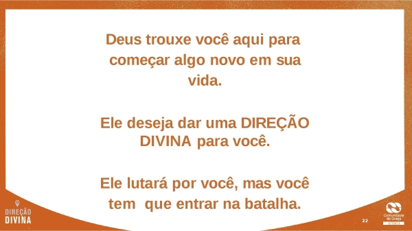 - Deus trouxe você aqui para começar algo novo em sua vida.Ele deseja dar uma DIREÇÃO DIVINA para você.Ele lutará por você, mas você tem que entrar na batalha.22