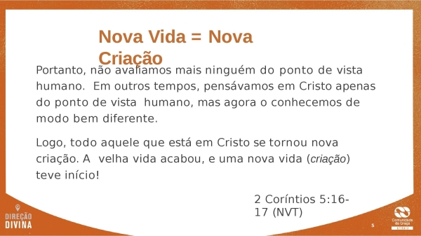 - Nova Vida = Nova Criação4Portanto, não avaliamos mais ninguém do ponto de vista humano. Em outros tempos, pensávamos em Cristo apenas do ponto de vista humano, mas agora o conhecemos de modo bem diferente.Logo, todo aquele que está em Cristo se tornou nova criação. A velha vida acabou, e uma nova vida (criação) teve início!2 Coríntios 5:16-17 (NVT)