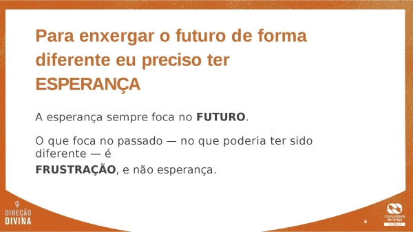 - Para enxergar o futuro de forma diferente eu preciso ter ESPERANÇA4A esperança sempre foca no FUTURO.O que foca no passado — no que poderia ter sido diferente — éFRUSTRAÇÃO, e não esperança.