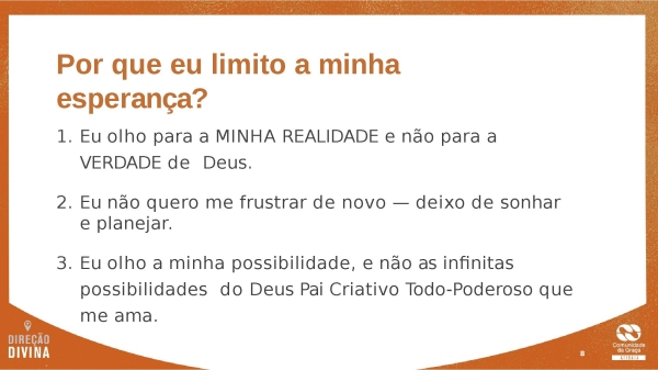 - Por que eu limito a minha esperança?8Eu olho para a MINHA REALIDADE e não para a VERDADE de Deus.Eu não quero me frustrar de novo — deixo de sonhar e planejar.Eu olho a minha possibilidade, e não as infinitas possibilidades do Deus Pai Criativo Todo-Poderoso que me ama.