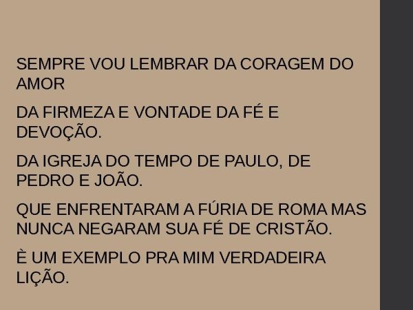 - SEMPRE VOU LEMBRAR DA CORAGEM DO AMOR DA FIRMEZA E VONTADE DA FÉ E DEVOÇÃO.DA IGREJA DO TEMPO DE PAULO, DE PEDRO E JOÃO. QUE ENFRENTARAM A FÚRIA DE ROMA MAS NUNCA NEGARAM SUA FÉ DE CRISTÃO. È UM EXEMPLO PRA MIM VERDADEIRA LIÇÃO.